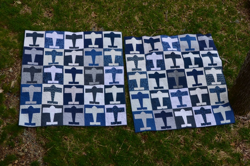 Many of the sets (each paired fat quarter makes two planes; a gray background and a navy background) I have enough for both boys to have the same plane. But some will be unique to one or the other.