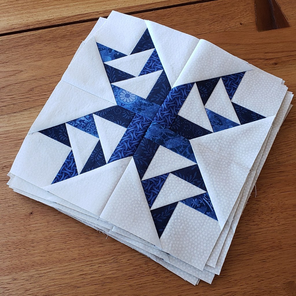 This Odd Fellow Star quilt pattern by Cindi Edgerton at averyspecialcollection, is what my nephew and his new bride chose for their wedding quilt. Three years ago! The tissue paper foundations were sew easy to work on, and using many fabrics from my stash I slowly but surely pieced and pieced.