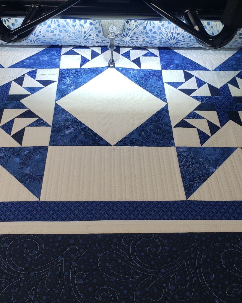 I took the time to stitch in the ditch with this quilt and sew glad I did. I used a combination of digital designs by Anne Bright, and Joyce Lundrigan to stich this quilt in layers.