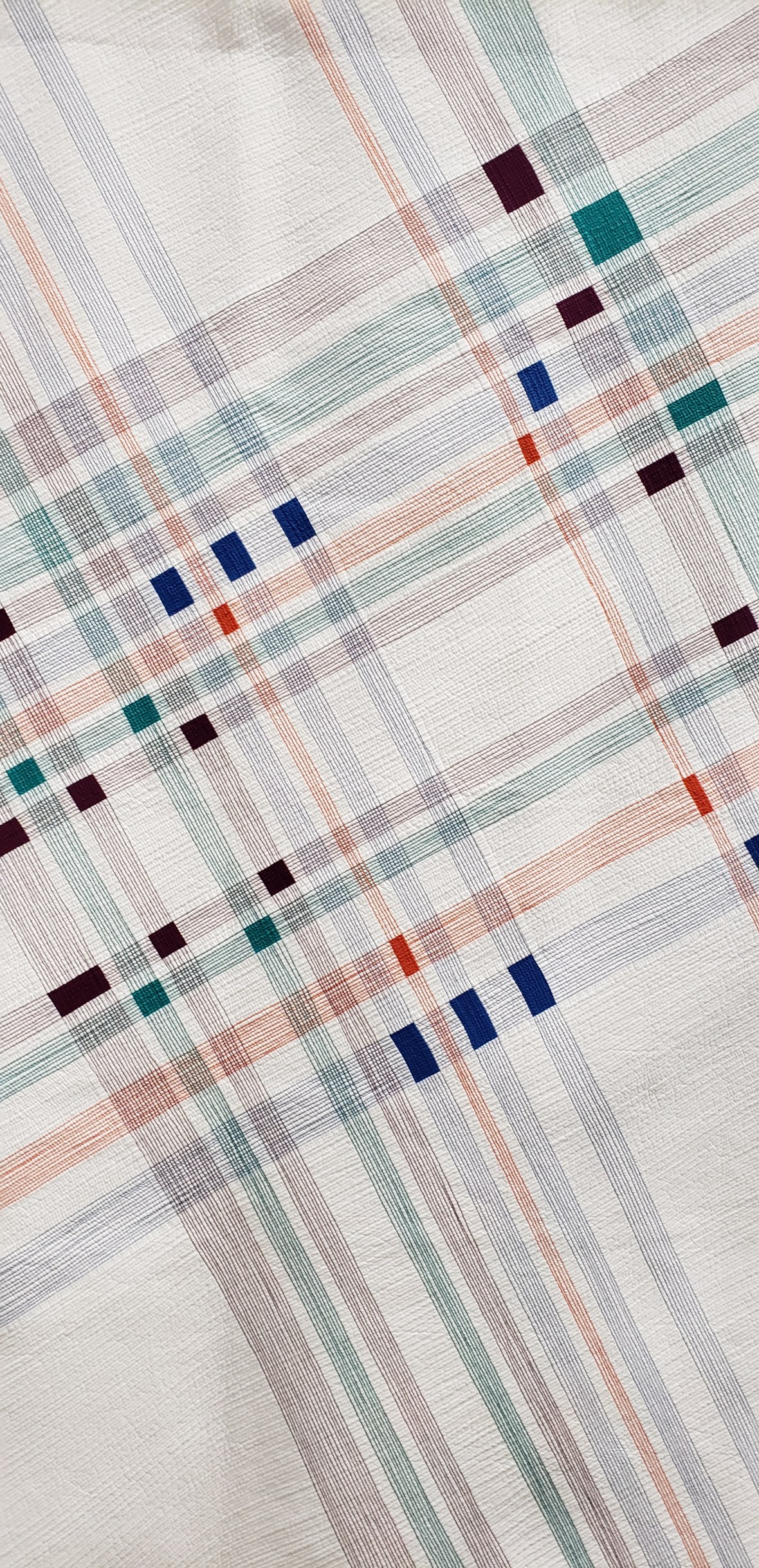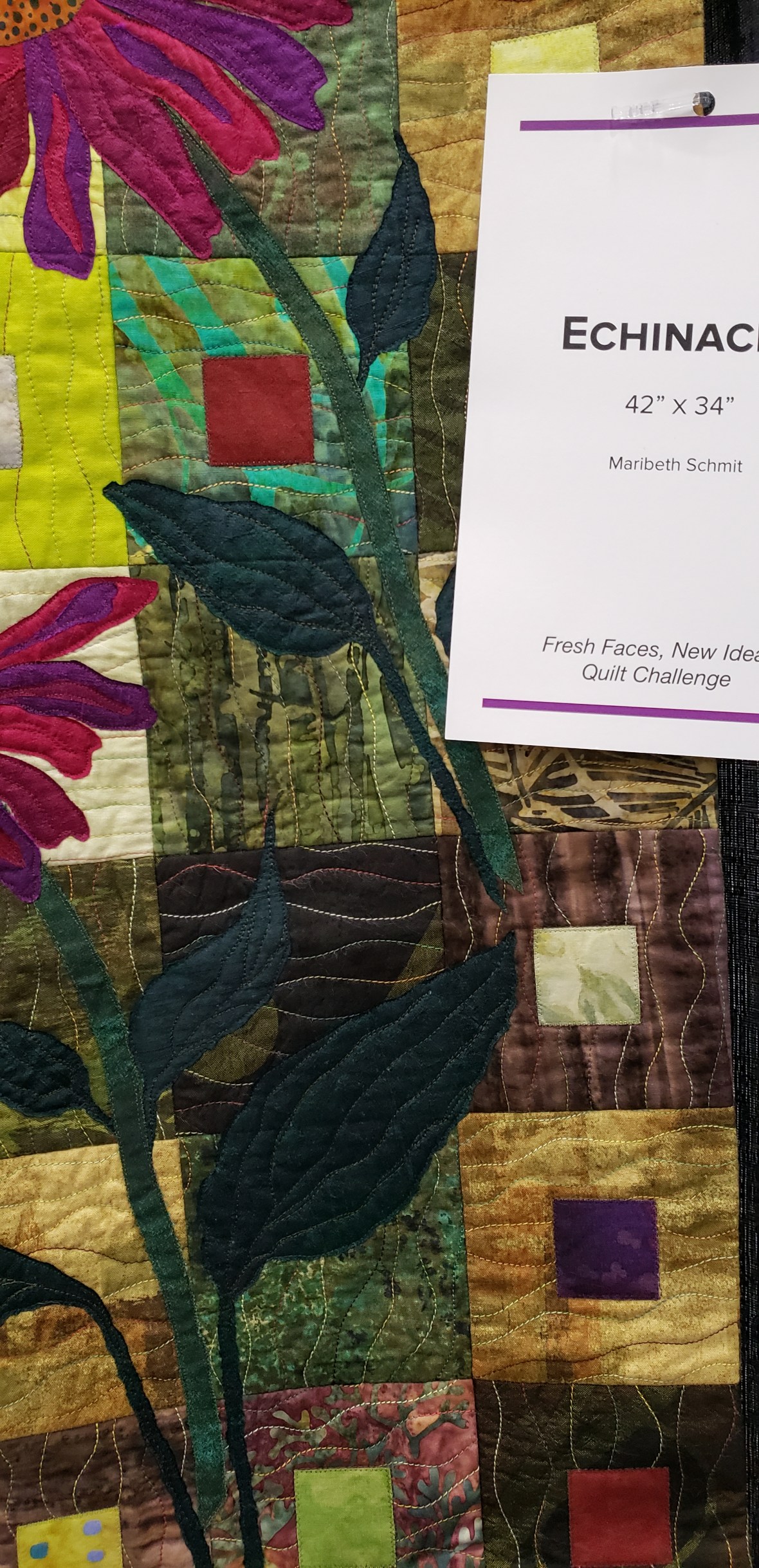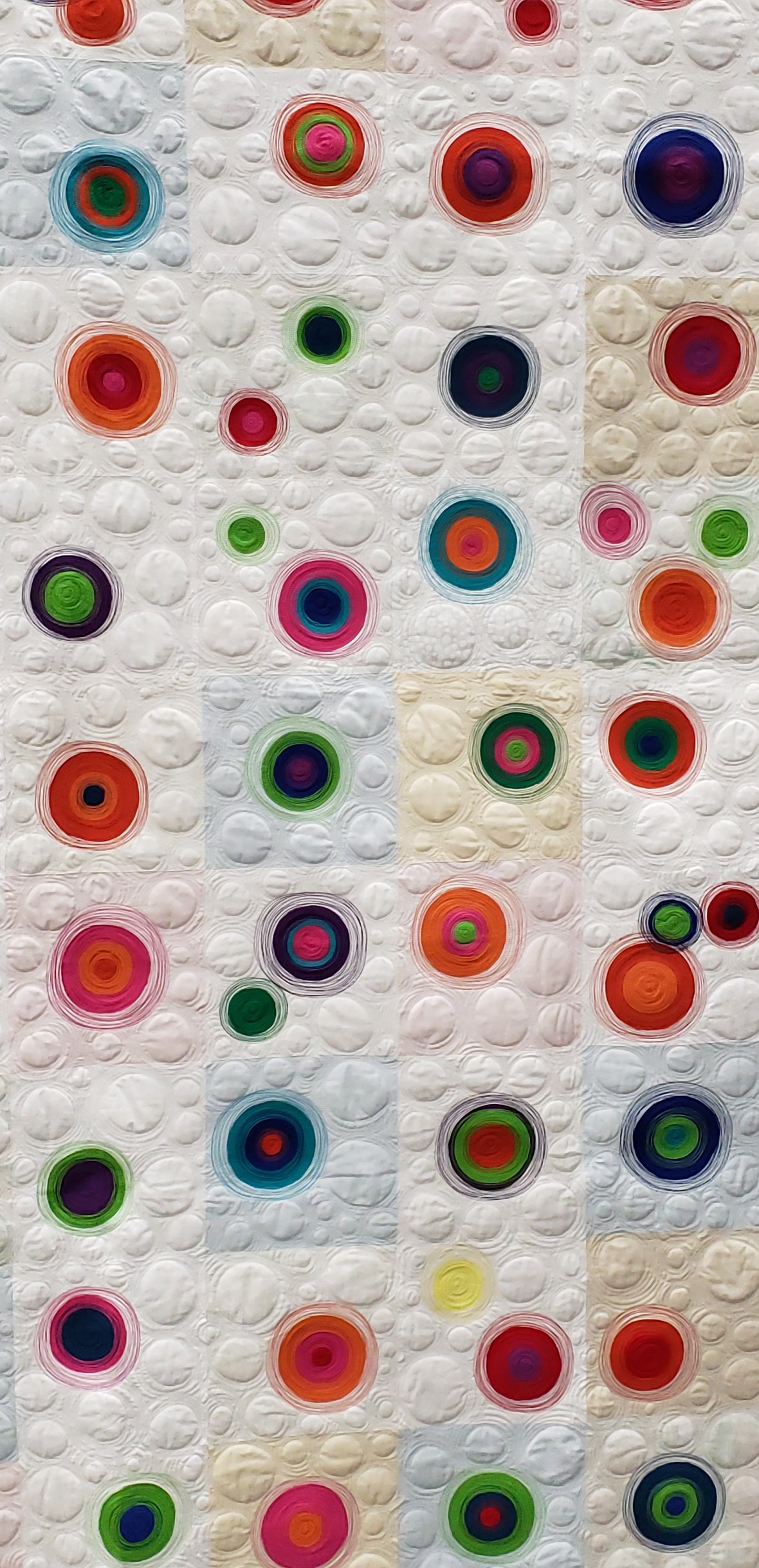 They were all cut up and stabilized and recut to the same size. Then to find the right framing fabrics. My top choices were a Cherrywood Citrus Splash pack or a Tango Print Rainbow Batik pack. Sew much fun color!Mind you I cut these up and did all this prep work in 2015. I had to decide how wide to make the borders, how could I get the biggest quilt possible with 7″ squares?
