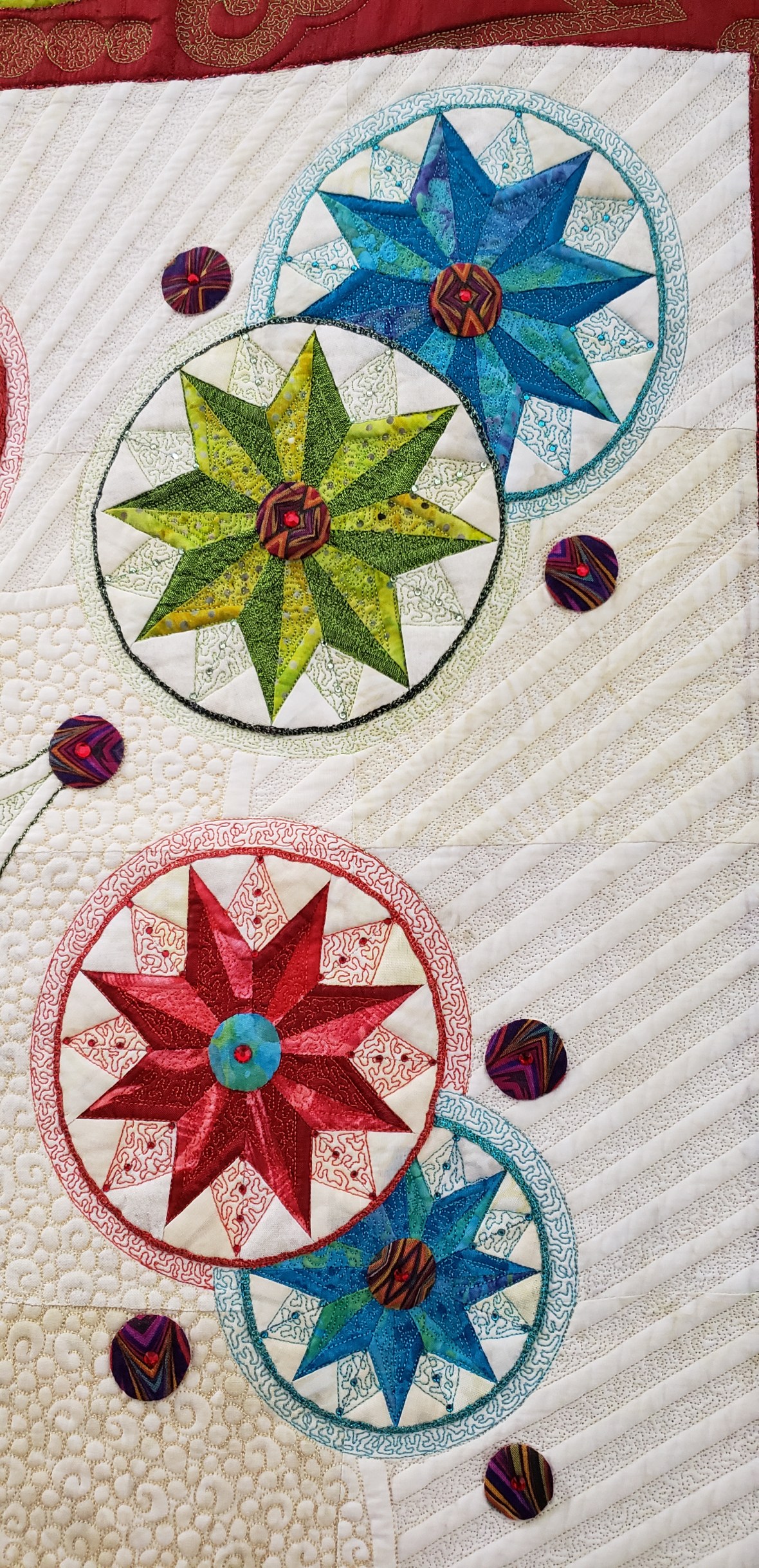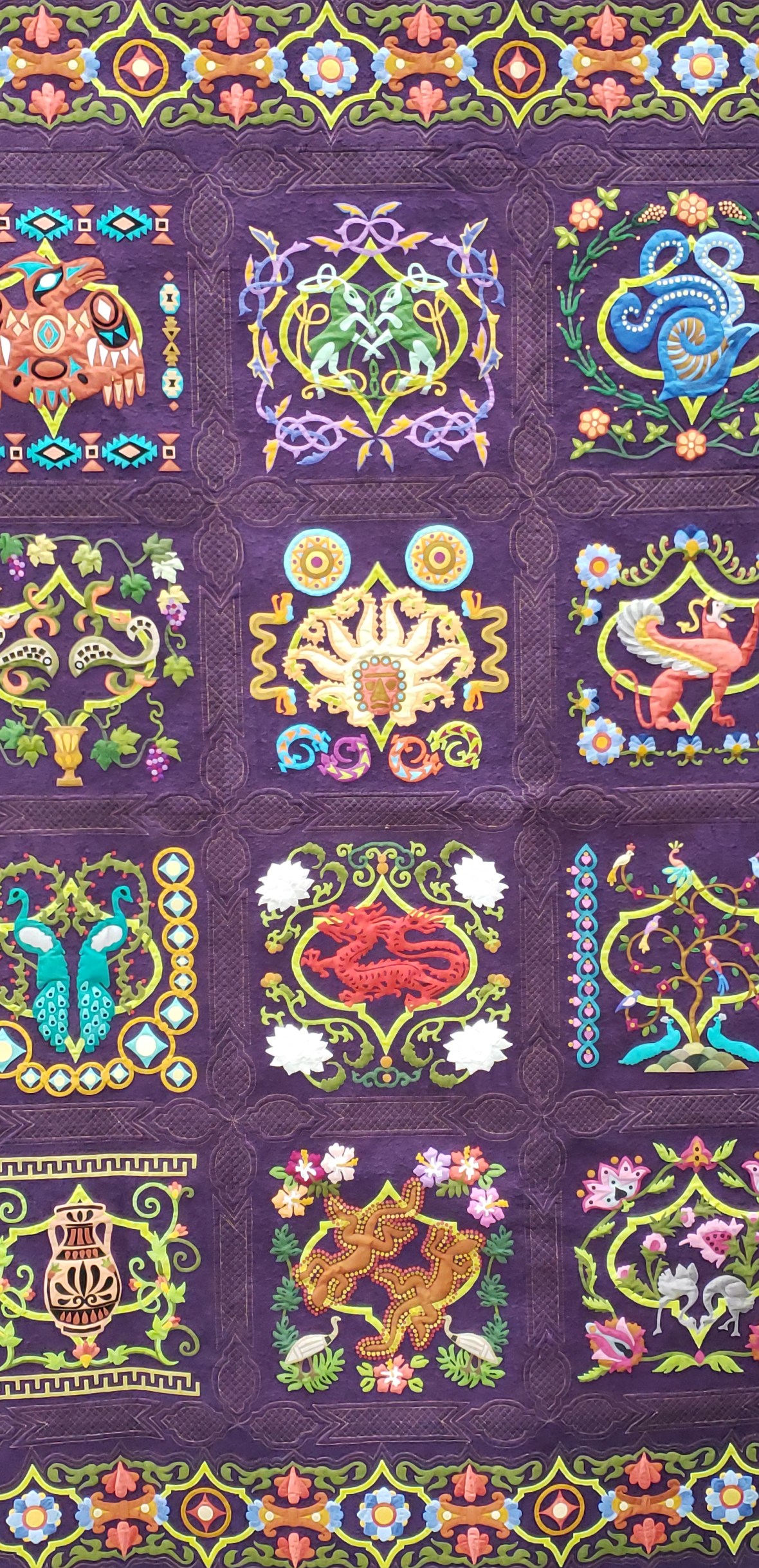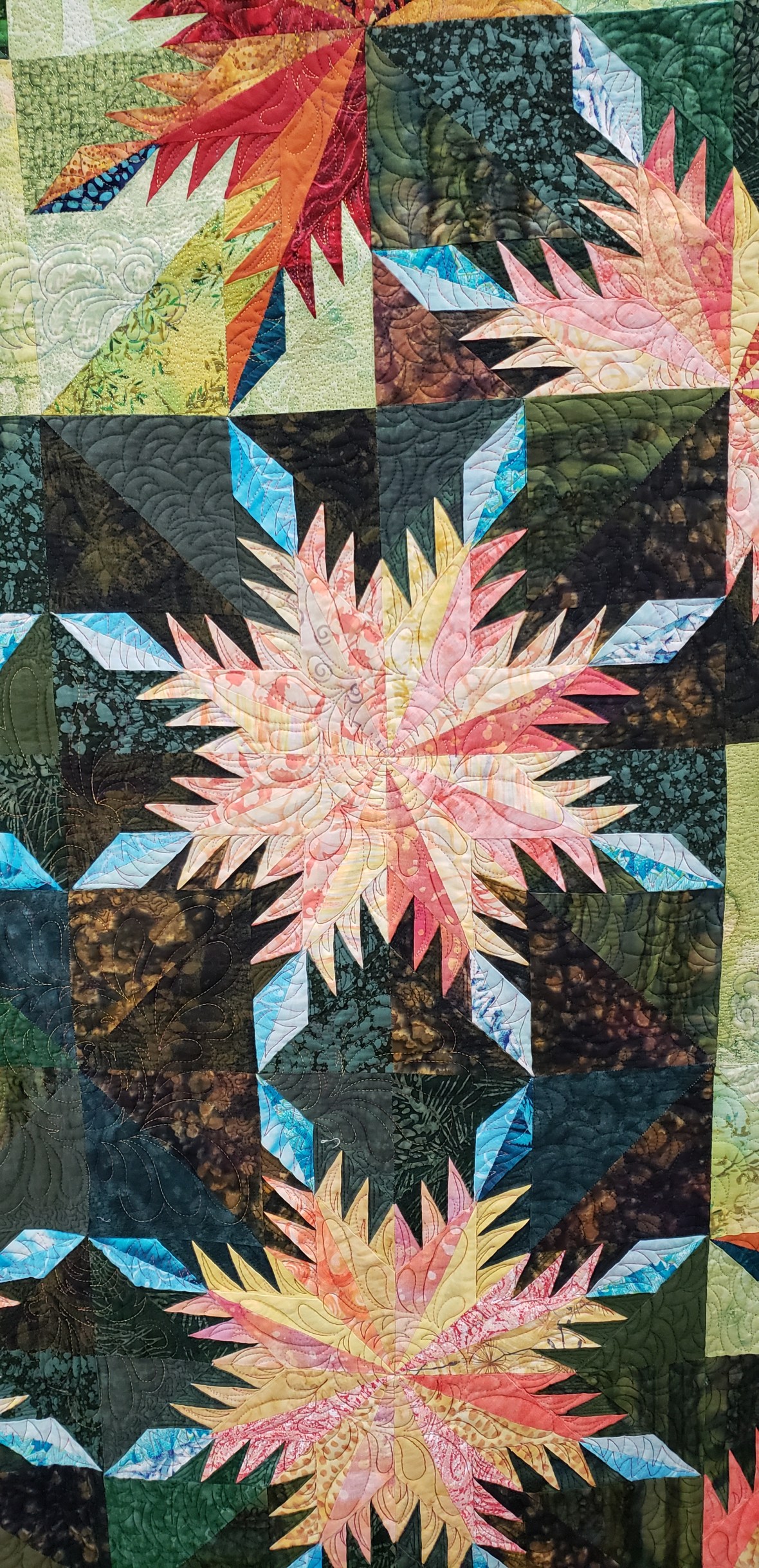 Finally it was time to arrange the blocks and sew them up. And I began dreaming of Jake’s face for the quilting design. This top hung in my basement for several months as I navigated copyright infringement and designer requests. I am happy to say the time spent was worth it to do it right!